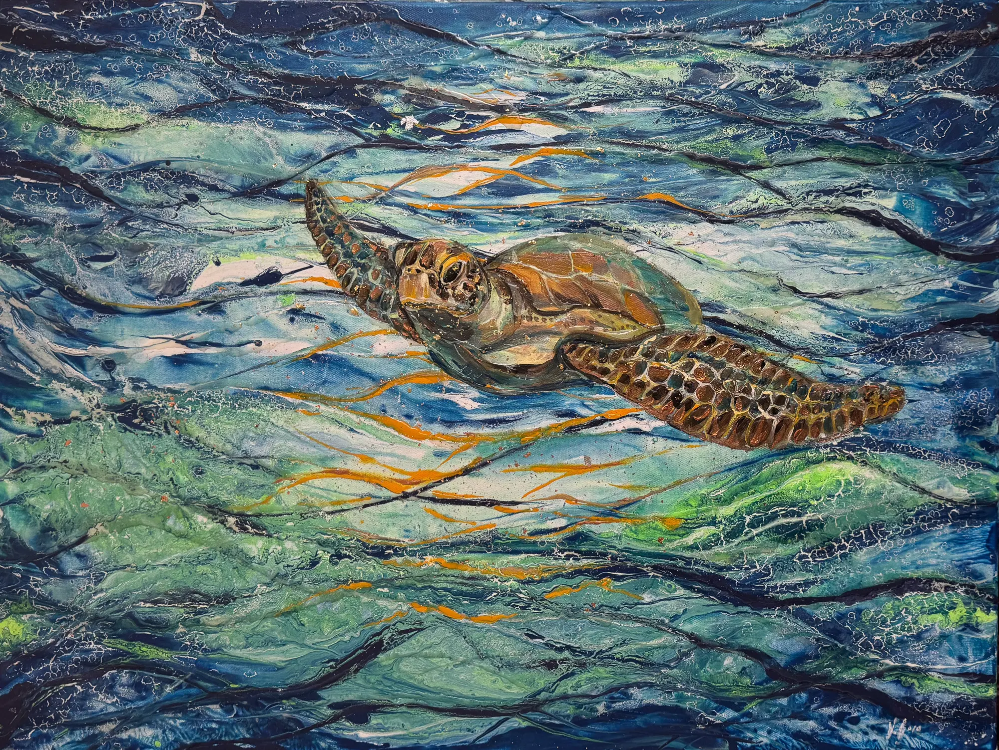 “This piece is about freedom and harmony felt in the movement of water. The turtle gliding through the waves symbolizes calm confidence and a deep connection with nature. I aimed to capture the ocean’s energy, where every brushstroke evokes a sense of motion and infinity.” – Yulia Altas