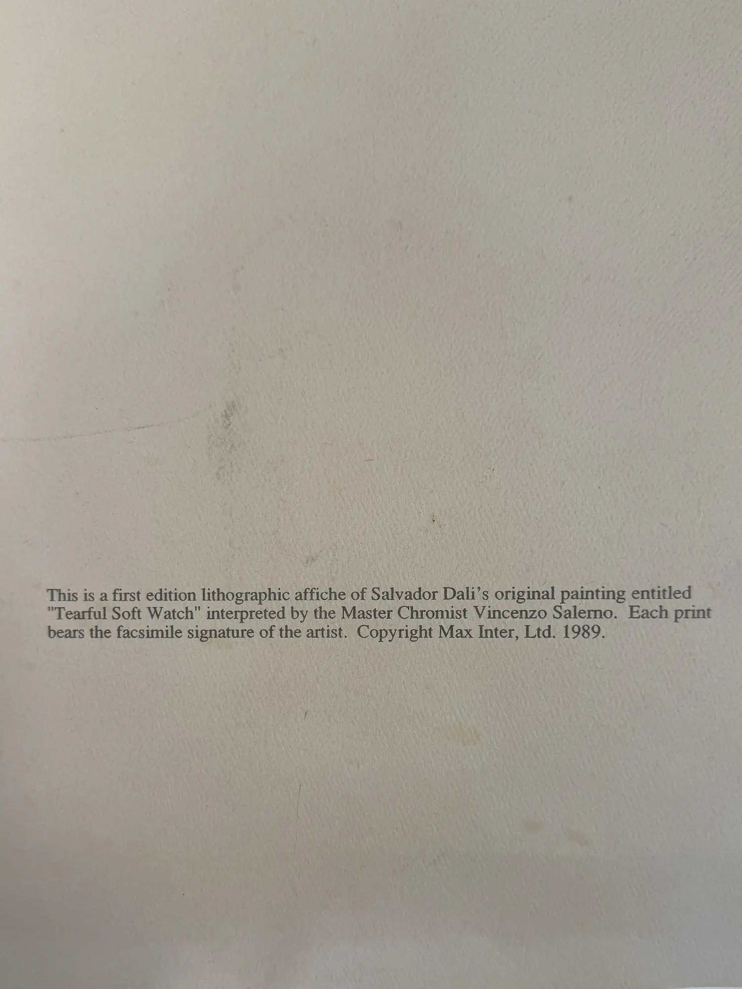 This is a first edition lithographic affiche of Salvador Dali’s original painting entitled “Tearful Soft Watch” interpreted by the Master Chromist Vincenzo Salerno. Each print bears the facsimile signature of the artist.